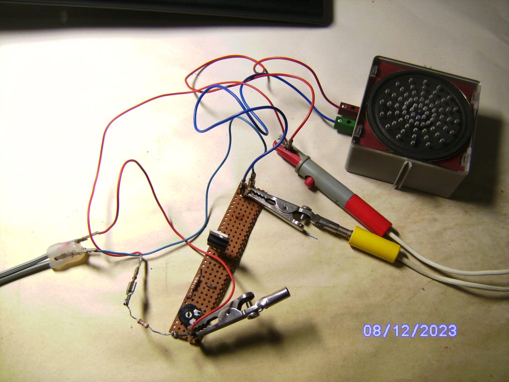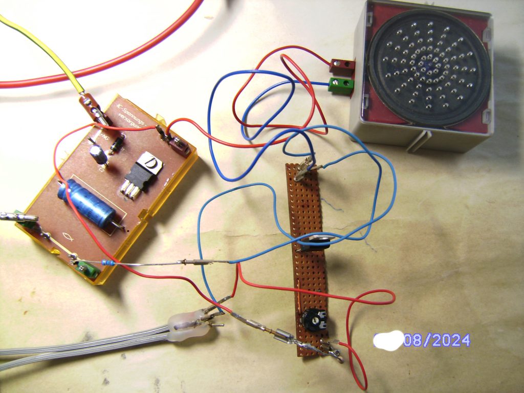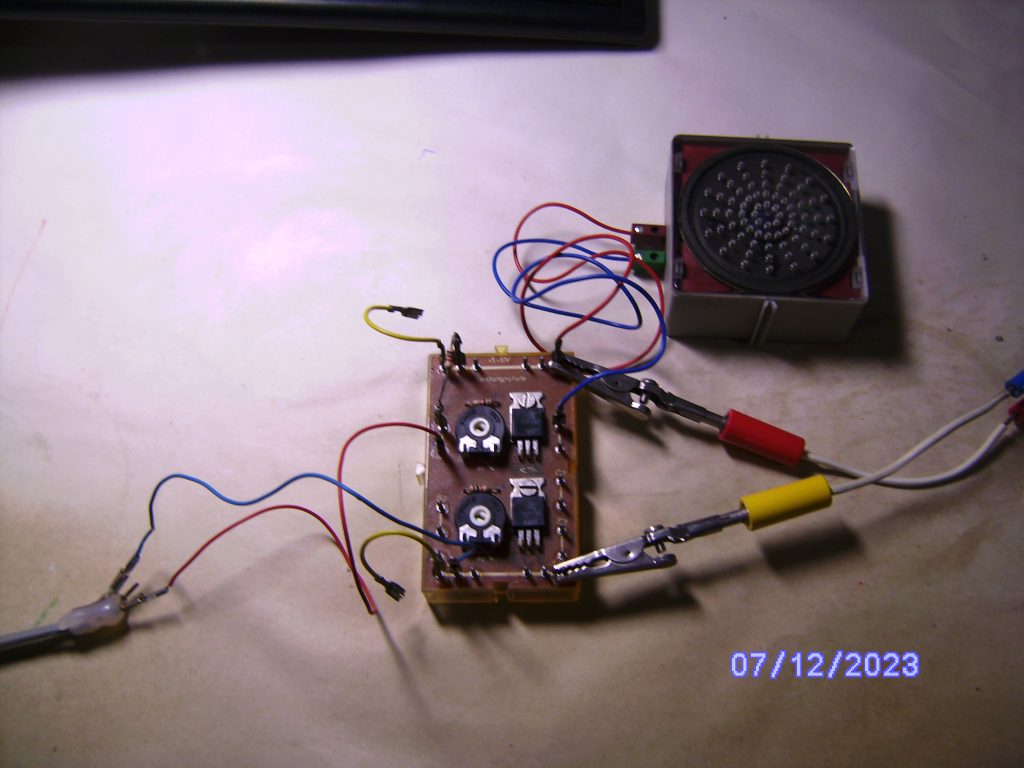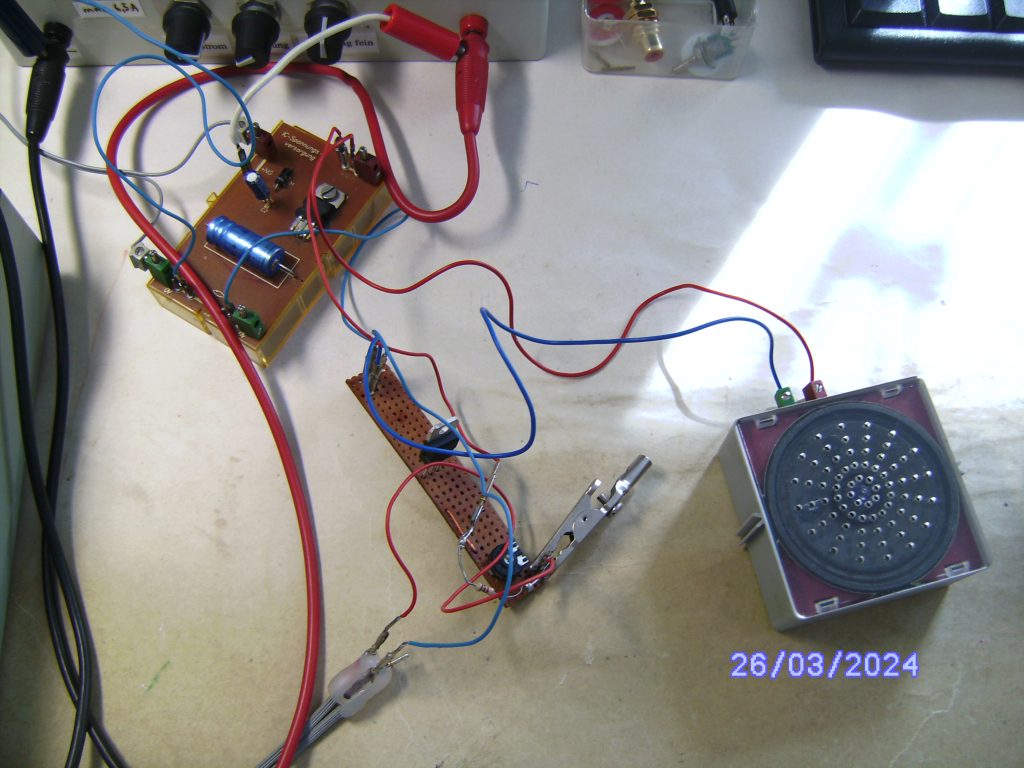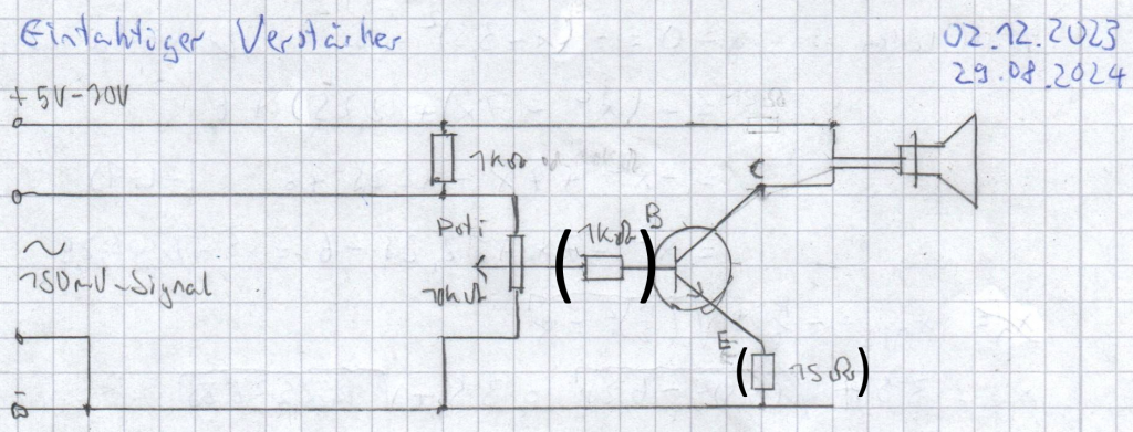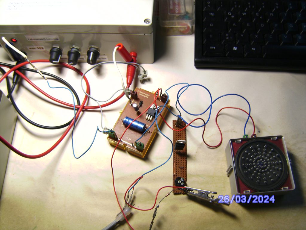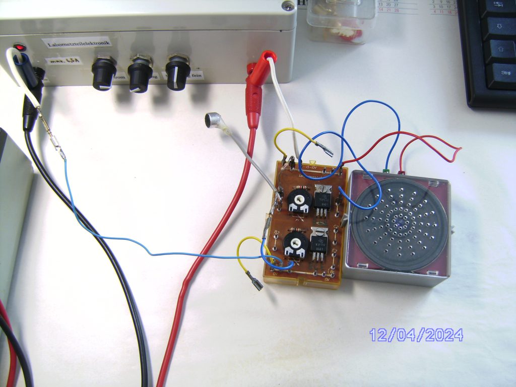 Eintaktverstärker mit Transistortyp TIP 110 (= Darlington-Transistor = zwei hintereinandergeschaltete Transistoren) (der zweite TIP-110-Transistor auf der Platine ist unbenutzt):