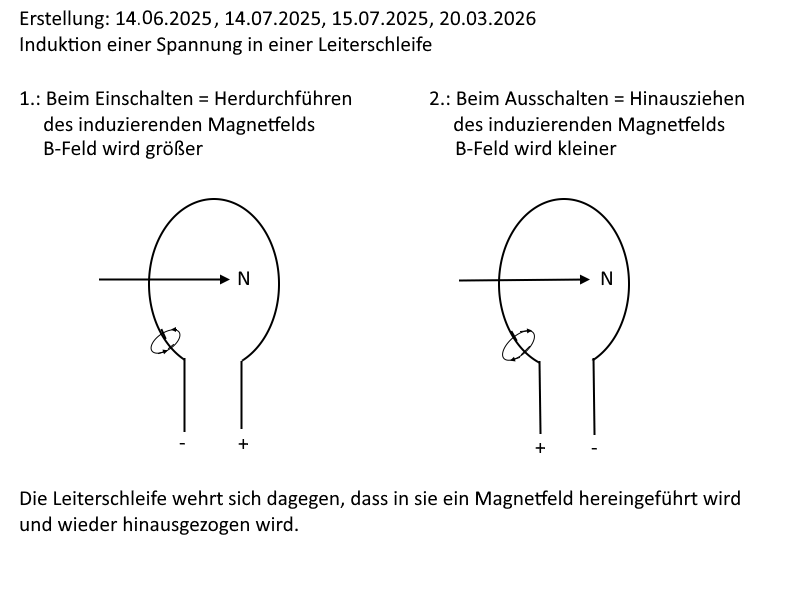 Die Leiterschleife steht senkrecht auf der Bildebene. Das Magnetfeld geht von links nach rechts durch die Leiterschleife herdurch. Wenn nun das Magnetfeld eingeschaltet wird, ist in dem Drahtende der Leiterschleife vor der Bildebene eine negatives Potential, hinter der Bildebene ein positives Potential. Erklärungung durch die Lenz´sche Regel: Die Lenz´sche Regel sagt, dass die Wirkung (das Magnetfeld des induzierten Stromes) dem von links nach rechts eintreffenden Magnetfeld entgegengerichtet ist, also diesem gegenüber antiparallel ist. Beim Ansteigen des Magnetfeldes fließt ein Strom, der an der Innenseite der Leiterschleife ein Magnetfeld bewirkt, das in die entgegengesetzte Richtung zeigt wie das Ursprungsmagnetfeld (= das induzierende Magnetfeld), also von rechts nach links. Dieser induzierte Strom in der Leiterschleife hat ein konzentrisches Magnetfeld um den Leiter herum. An der Innenseite der Leiterschleife, da wo also das Magnetfeld von links nach rechts herdurchtritt, ist die Richtung der konzentrischen Magnetfeldkreise des Induktionstromes dem herdurchtretenden Magnetfeld entgegengesetzt, sie zeigen also an der Innenseite der Leiterschleife in diesem Fall nach links. Es will es also abschwächen. Der Induktionsstrom fließt in diesem Fall an der Vorderseite der Leiterschleife nach unten, so dass man vorne ein negatives Potential hat. Beim Abfallen des Ursprungsmagnetfeldes fließt ein Strom der ein Magnetfeld bewirkt, das in die gleiche Richtung zeigt wie das Ursprungsmagnetfeld. Es ist also parallel zu diesem. Es will es also aufrechterhalten. Der Induktionsstrom (= der induzierte Strom) ist in diesem Fall also umgekehrt. Hiermit ist die erhöhte Induktivität L in H = Henry = Vs / A einer Leiterschleife bzw einer Spule begründet. Das sich eine Leiterschleife bzw eine Spule aufgrund der Lenz´schen Regel quasi dagegen wehrt, dass in sie magnetische Feldlinien eingebracht und/oder wieder herausgezogen werden, steht auch im Physikbuch von Hans J. Paus, “Physik in Experimenten und Beispielen” auf Seite 343 und Seite 345. Der Text zu dem Bild 27.9 auf Seite 343 beschreibt den Sachverhalt allerdings falsch herum.