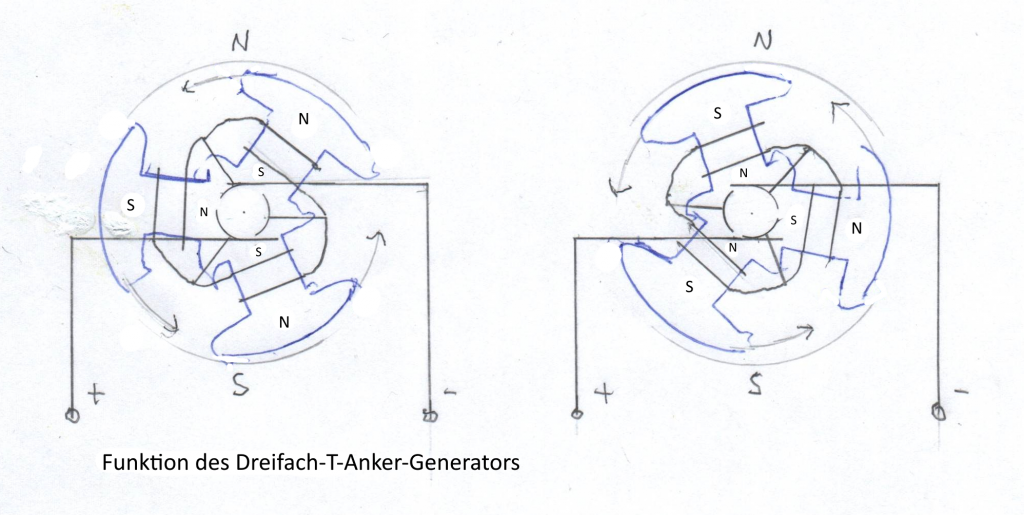 Jeder Motor läuft auch immer als Generator und umgekehrt. Das stellte Emil Lenz aus dem heutigen Estland im Jahr 1830 fest. Das Zusammenwirken der Motor- und der Generatorfunktion bei entweder Motorbetrieb oder Generatorbetrieb wird in dem Text „Lorentzkraft und Induktion“ erklärt. Die Generatorfunktion beim Dreifach-T-Anker-Motor ist schwieriger zu erklären als beim Trommelanker-Motor. Die Generatorfunktion beim Trommelanker-Motor wird hier nicht erklärt, sie ist aber sehr einfach. Es soll im nachfolgenden Text die Beschreibung der elektrophysikalischen Vorgänge im Dreifach-T-Anker-Motor wiedergegeben werden. Beidesmal lässt sich die Generatorfunktion mit dem Lorentz-Kraft-Gesetz erklären, beim Dreifach-T-Anker-Motor muss noch die Theorie eines Hineinführens und Herausnehmens eines Magnetfeldes in bzw. durch eine Leiterschleife bzw. eine Spule mit herangezogen werden. Dabei existiert das Faktum, dass die Spule sich quasi dagegen wehrt, dass in sie magnetische Feldlinien hineingeführt und herausgenommen werden. Das heißt, dass ein Elektronenstrom induziert wird, der an der Innenseite der Spule ein Magnetfeld bewirkt, das sich antiparallel zu den hineingeführten Magnetfeldlinien und parallel zu den herausgenommenen Magnetfeldlinien richtet. Diese Theorie steht im Physikbuch von Hans J. Paus im Kapitel 27.5, Bild 27.9 auf Seite 343. In dem Text zu dem Bild ist der Sachverhalt allerdings falsch herum beschrieben.