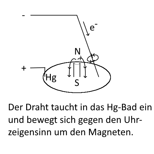 Der erste Elektromotor war ein Gleichstrommotor. Im Jahr 1821 erfand ihn der englische Physiker und Chemiker Michael Faraday, durch die Erfindung eines in ein Quecksilberbad eintauchenden Leiters der sich um einen darin stehenden Stabmagneten herum dreht. Eine Drehung eines Leiters um einen Stabmagneten bzw. eines Stabmagneten um einen Leiter, findet nur dann statt, wenn der Leiter bzw. der Stabmagnet nahezu parallel senkrecht zu dem Stabmagneten bzw. zu dem Leiter aufgehängt ist. Der französische Physiker André Marie Ampère stellte im Jahr 1820 fest, dass eine Kompassnadel sich immer quer senkrecht zum Strom bzw. Leiter ausrichtet. Hierbei existiert keine resultierende Lorentzkraft die die Kompassnadel bzw. den Stabmagneten herum rotieren lässt. Wenn aber Draht und Stabmagnet zueinander fast parallel senkrecht in ein Quecksilberbad eintauchen, existiert vom Magnetfeld des Stabmagneten herrührend eine Ebene im allerseits fast 90°-Winkel auf dem Gleichstrom bei der sich die Magnetfeldlinien des Stabmagneten in die gegenteilige Richtung wenden, weil sie ja vom inneren des Stabmagneten über den hier Nordpol nach außen dringen. Das bewirkt, dass sich auf der hier hinteren Seite das Magnetfeld mit dem Gleichstrommagnetfeld subtrahiert und auf der hier vorderen Seite addiert mit dem Ergebnis dass eine resultierende Lorentzkraft, die gegen den Uhrzeigersinn gerichtet ist, daraus erzeugt wird.
